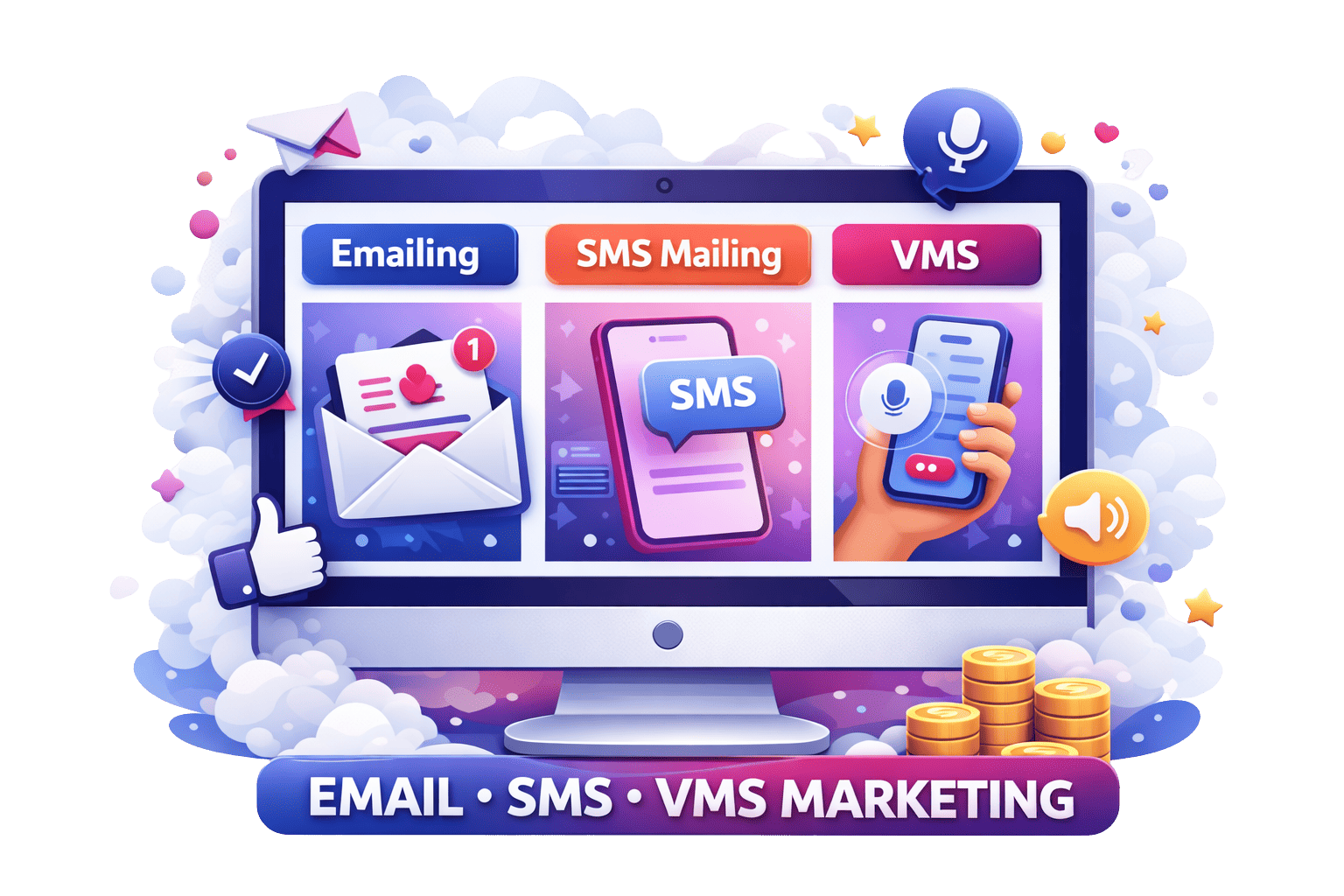 Emailing, SMS et VMS marketing – Fidélisez et relancez vos clients